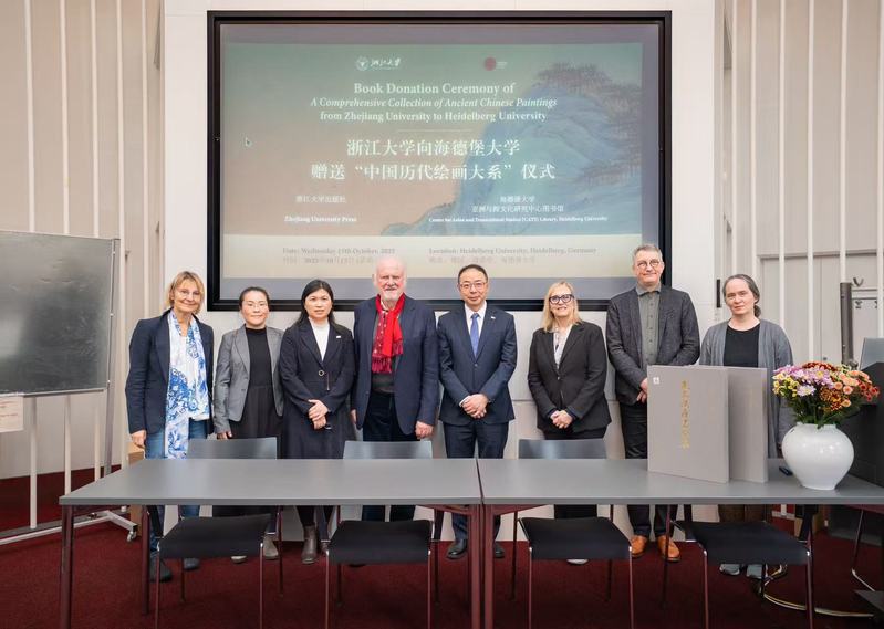 10月15日,浙江大学向海德堡大学赠送“中国历代绘画大系”仪式在海德堡大学亚洲与跨文化研究中心图书馆(以下简称CATS图书馆)举行。浙江大学出版社党委书记、董事长吴晨,浙江大学出版...